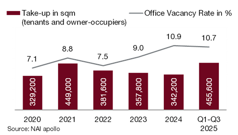 Market-active vacancies remained broadly unchanged over the course of 2025. At the end of September, a total of around 1.22 million sqm was available for short-term lettings, equating to a vacancy rate of 10.7 %. “This is in line with the level seen in the first quarter of 2025 and represents a reduction of 0.1 percentage points compared to the middle of the year. Following the rapid increase in vacancies in previous years, the current prolonged stabilisation is a positive development. However, longer-term comparisons provide a more sobering view. At the end of September 2023, the market vacancy rate was still 9.0 %, or 1.7 percentage points below the current figure,” said Angersbach.