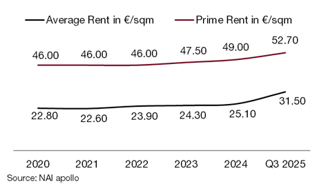 Demand for office space in central locations, especially for modern, high-quality space, remains high despite the higher rents. The proportion of leases in projects, new buildings and refurbishments has continued to increase and currently stands at around 60 % in the segment above 1,000 sqm (Q1-Q3 2024: 52 %). As a result, rental levels rose again. “The prime rent at the end of the third quarter stood at €52.70/sqm, which is €0.20/sqm more than in the previous quarter and €4.70/sqm more than in the previous year. Owing to large-scale new lettings in central locations, the area-weighted average rent rose by €0.30 or €6.90/sqm and now stands at €31.50/sqm,” said Kanzler.